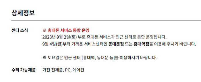 한편 기존 LG 서비스 센터 중 이번주 9월2일까지만 휴대폰 수리가 가능한 곳이 제법 됩니다. (예: 충무로센터) 해당 센터가 없어지는 것은 아니고...휴대폰 한정으로 수리를 하지 않는 것 입니다만...그만큼 LG 휴대폰 수리 수요 자체도 줄어 들고 있음을 얼추 짐작해볼 수 있습니다. (홈페이지 보면 '서비스 통합'이라고 표현합니다만...)